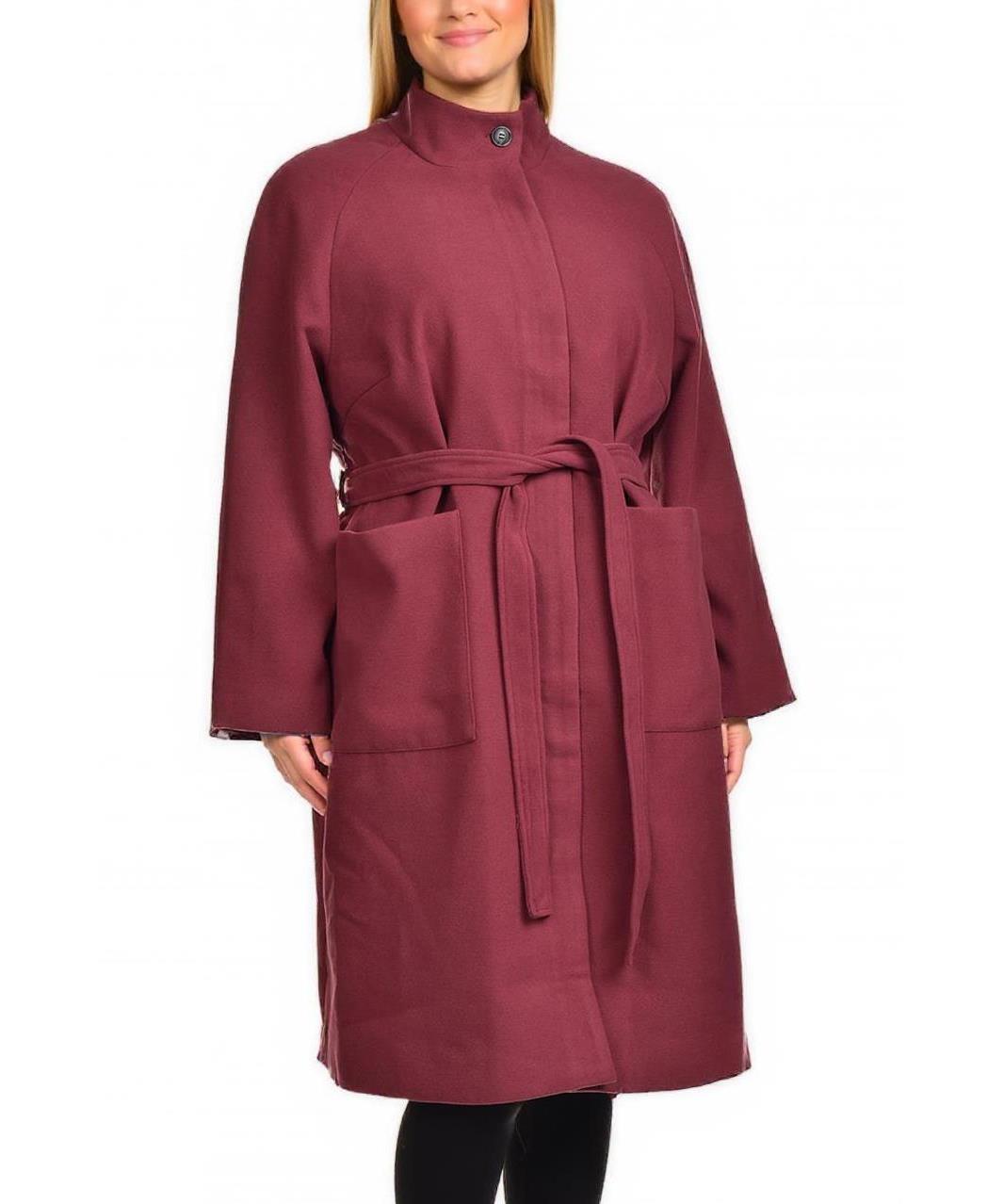 Елегантно дамско палто от вискоза в бордо. Свободен силует с колан, висока яка и големи джобове. Меко, топло и универсално за ежедневно и по-официално облекло през хладните месеци. Комфортна и стилна