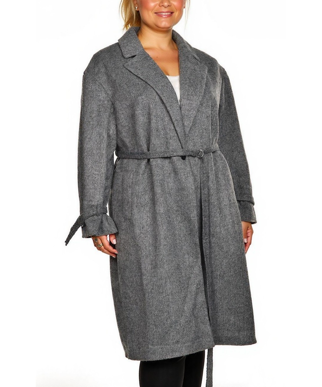 Елегантно дамско палто в сив меланж, дължина до коляното, с ревера, колан в талията и декорирани маншети. Топло, практично и стилно за ежедневие и офис през студените месеци. Мека вълна, лесна поддрж.