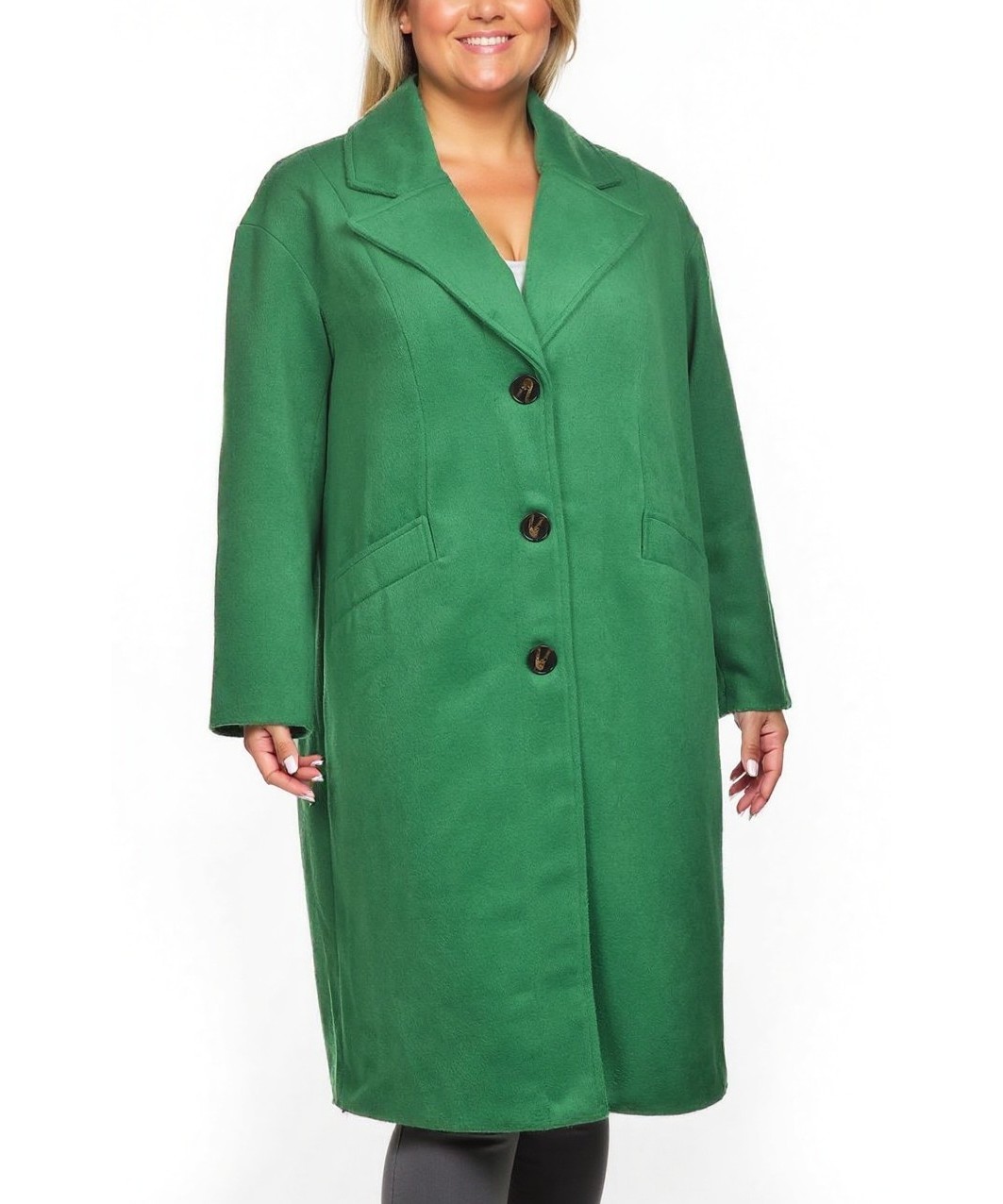 Елегантно дамско вълнено палто в наситено зелен цвят, с ревери, три копчета и джобове. Прав силует, средна дължина, подходящо за студено време и официални или ежедневни визии. Стилен избор за всеки ден
