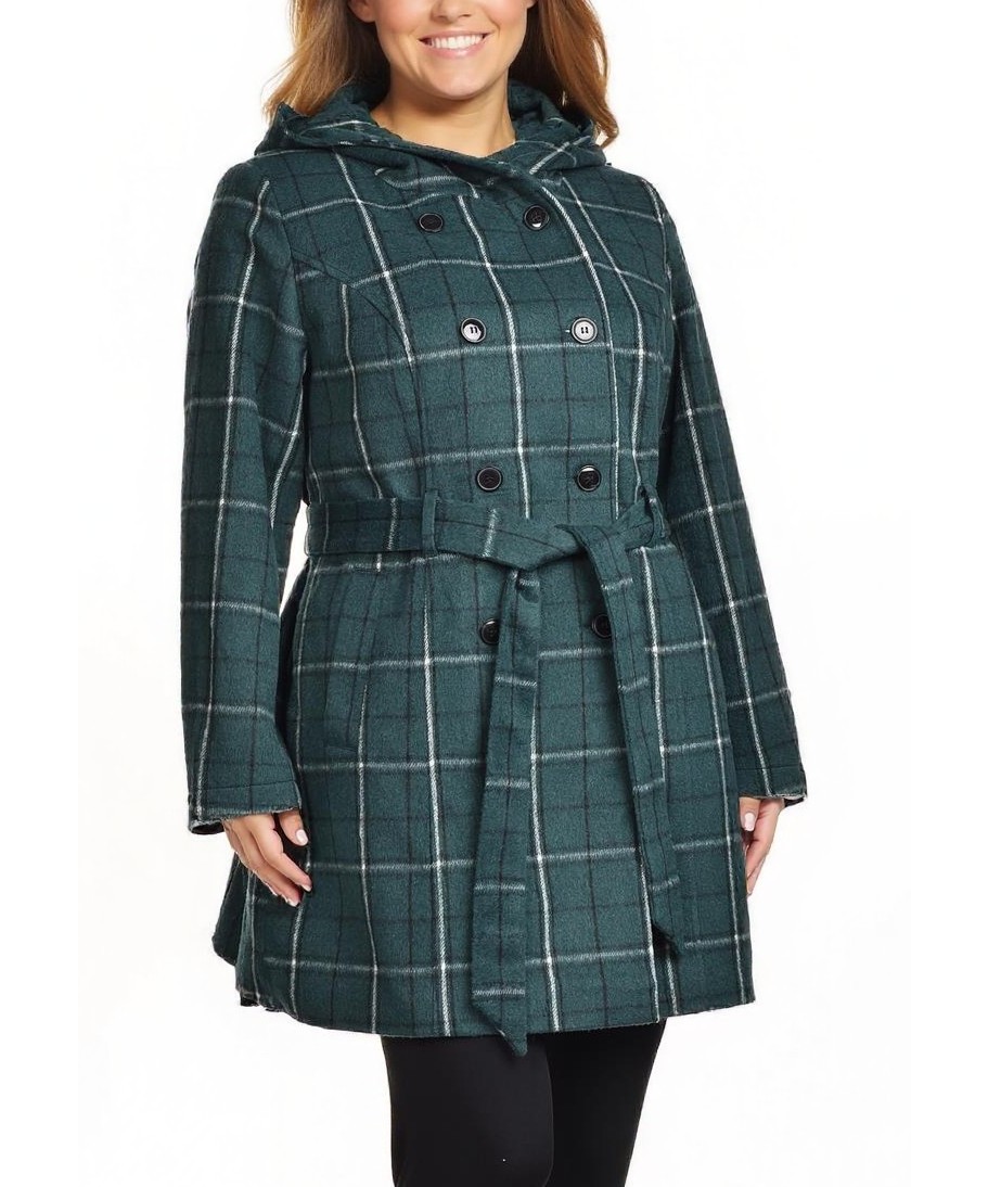 Стилно дамско палто в зелено каре, двуредно с копчета, колан и качулка. Топло, структурирано, до среден дължина. Подходящо за елегантни и ежедневни визии през студените месеци. Подплата мека, удобна!