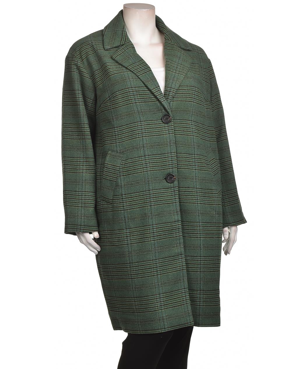 Елегантно дамско палто в зелено каре, средна дължина, обемен силует с два копчета и класически ревери. Топло, удобно, с джобове – идеално за ежедневен и делови стил. Подходящо за есен и зима. Подплата.