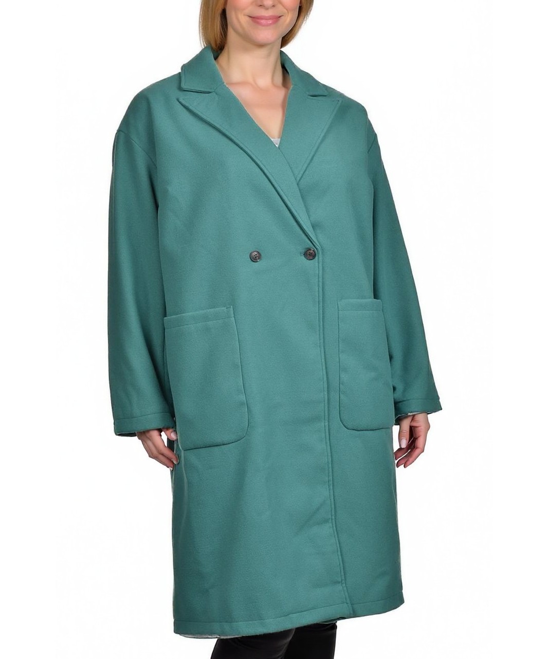 Елегантно дамско палто от вискоза в тюркоазено-зелено, с права, леко оувърсайз кройка, двуредно закопчаване, големи джобове и средна дължина. Меко и удобно за всеки ден и офис. Стилен избор за пролет.
