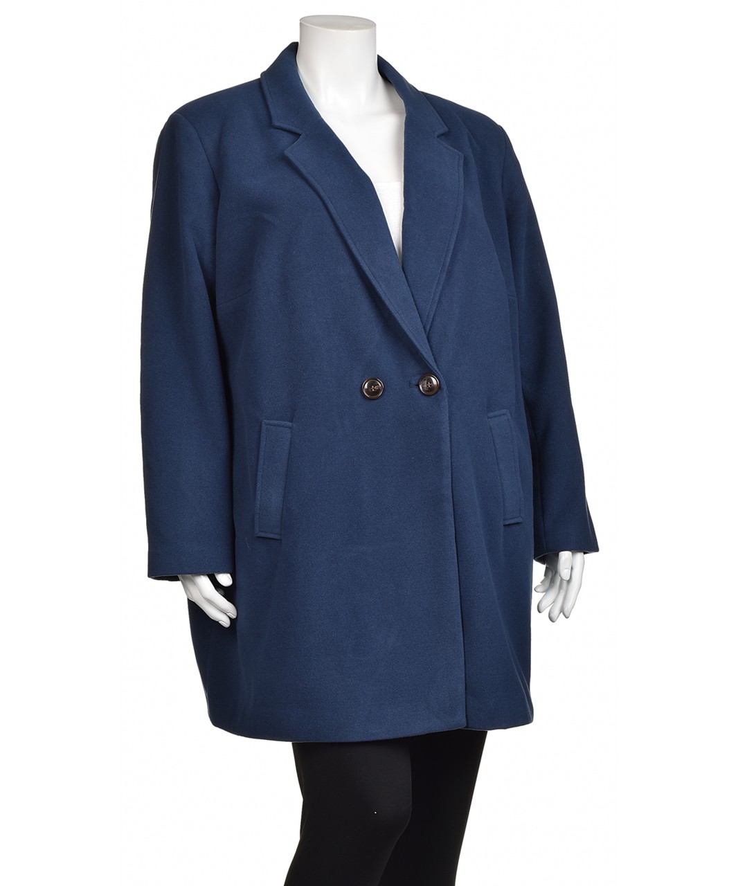 Елегантно дамско палто от вискоза в тъмносин цвят. Прав силует с ревери, двуредно закопчаване с две копчета и дискретни джобове. Меко, топло и стилно за офис и ежедневна употреба. Лесна поддръжка. Шик