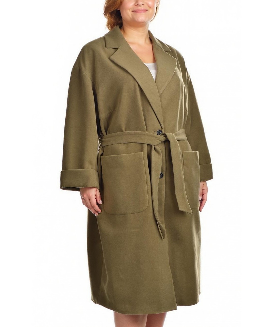 Елегантно дамско палто от вискоза в маслено зелен цвят. Свободна кройка с пояс, ревери, дълги ръкави и големи джобове. Топло, меко и стилно за преходния сезон. Подходящо за офис и свободно време..
