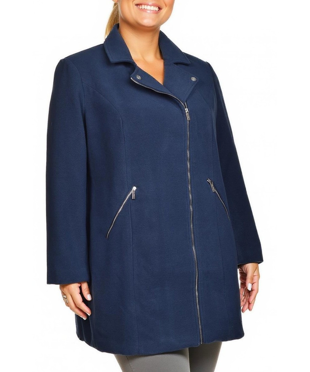Елегантно дамско палто от вискоза в тъмносин нюанс. Меко, дишащо и приятно на допир, с прав силует, скосен цип отпред и декоративни джобове с цип. Подходящо за ежедневни и официални визии. Стилна класика