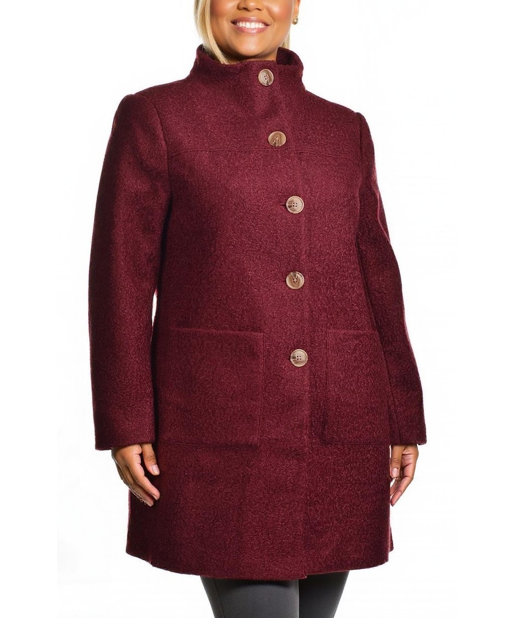Елегантно дамско вълнено палто в бордо, прав силует до средата на бедрото. Стояща яка, големи дървени копчета и два предни джоба. Топло, стилно и подходящо за есен-зима. Подходящо за работа и вечерни