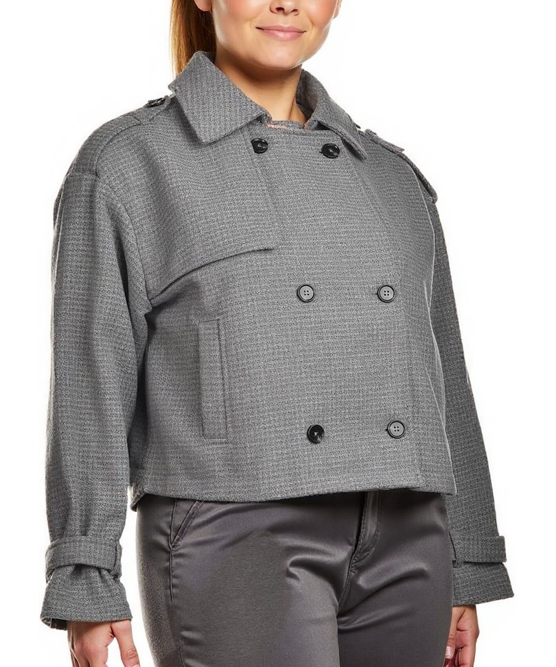 Късо дамско палто в сив меланж с двуредно закопчаване и класическа яка. Модерен къс силует, джобове, декоративни презрамки на раменете и маншети с каишки. Подходящо за пролет и есен. С фина подплата .