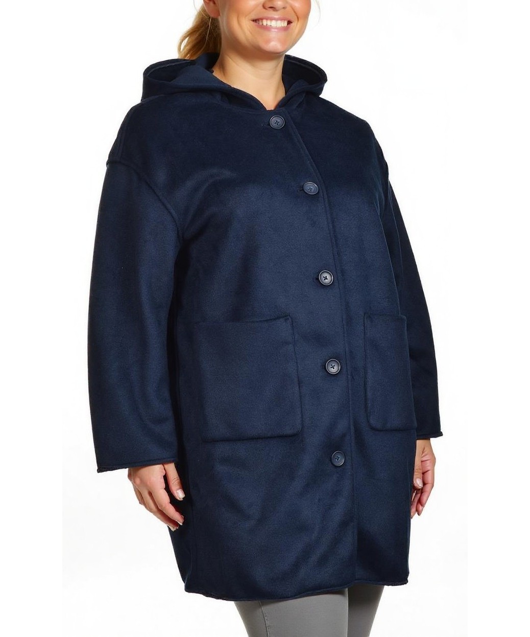 Елегантно дамско палто от вискоза в тъмносин цвят, с качулка, големи джобове и копчета. Свободна, удобна кройка за прохладни дни, мека и стилна междинна връхна дреха. Подходящо за есен и пролет, лесно
