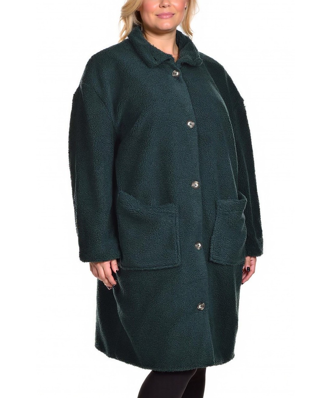Топло дамско палто от пухкава плюшена материя в тъмнозелен цвят. Свободна кройка, средна дължина, класическа яка, закопчаване със копчета и големи предни джобове. Идеално за студено време. Шик и уют.!!