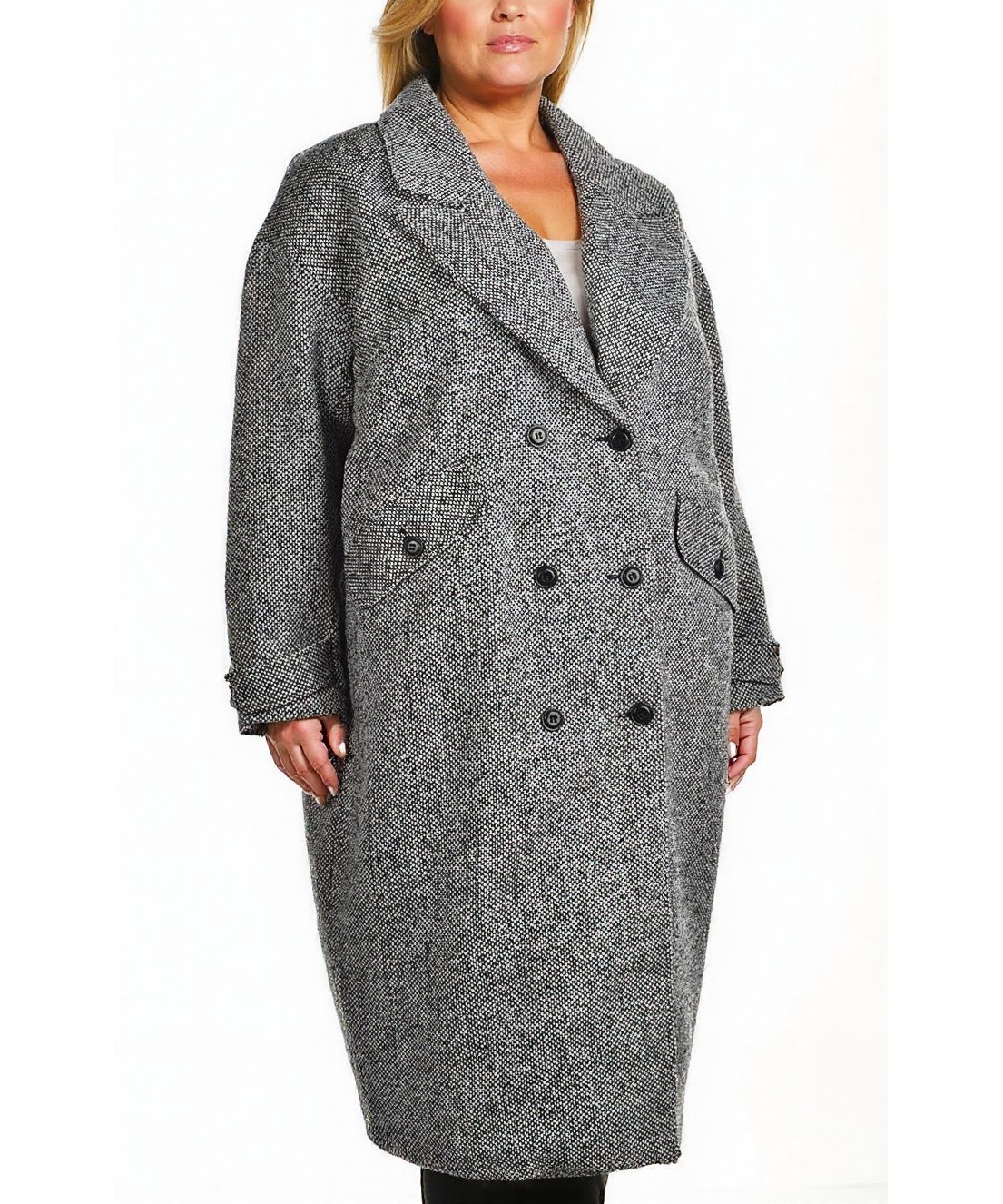 Елегантно дамско палто в сиво меланж, двуредно закопчаване и широки ревери. Свободна, права кройка с дължина под коляното, топла вълнена материя, джобове с капаци – идеално за есен/зима. Подплатено.