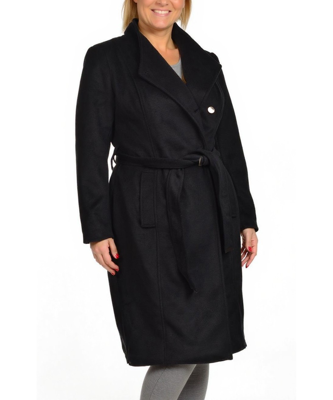 Елегантно дамско палто от вискоза в черно. Дължина до коляното, колан, ревери и дискретни джобове. Топло, комфортно и стилно решение за сезона и официални поводи.