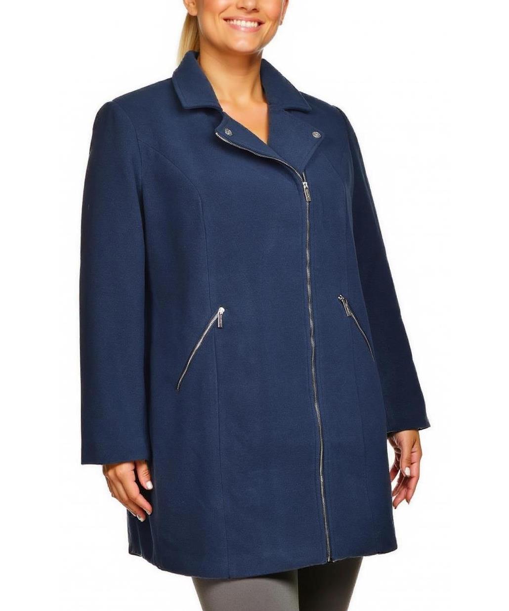 Елегантно дамско палто от вискоза в дълбоко синьо. Прав силует, асиметричен цип, джобове с ципове и меко неплъзгащо се вътрешно покритие. Идеално за дъждовни и прохладни дни. С класическа кройка и лека.