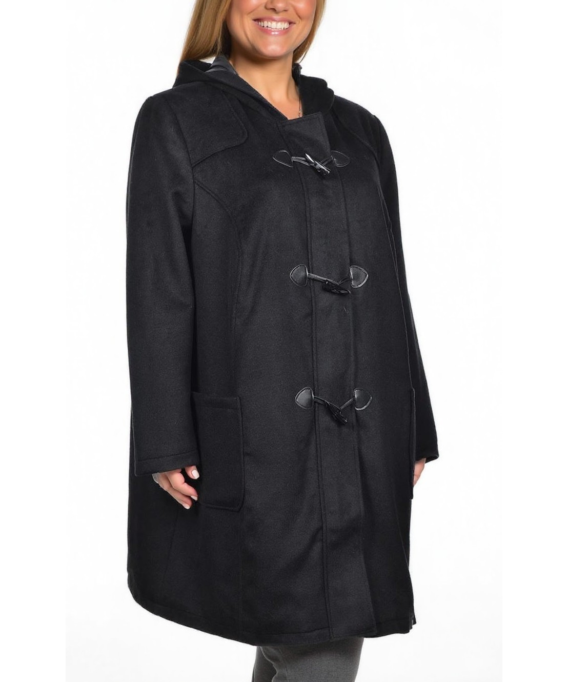 Елегантно дамско палто от вълнена смес, черно, с качулка и класически дуфъл дизайн. Топло, с практични джобове и характерни копчета-тогъли. Идеално за студените дни и ежедневие. Подходящо за всеки ден.