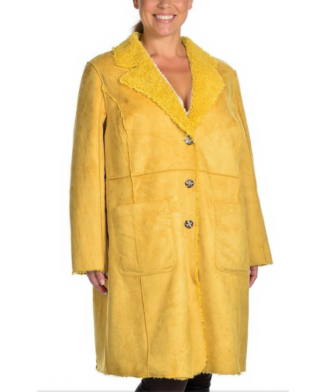 Дамско двулицево палто в горчично жълт цвят, от мека еко кожа с пухена вътрешна подплата. Прав силует, големи предни джобове и декоративни копчета. Топло и стилно за студените дни. Универсален размер.