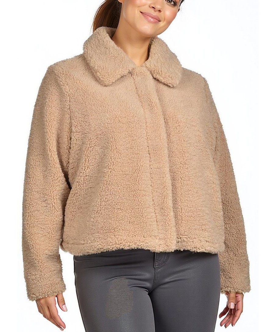Дамско палто в светло бежов цвят, изработено от мек и пухкав материал, който осигурява топлина и комфорт. Моделът е с класически яка и прав силует, подходящ за ежедневна употреба през студените месеци.
