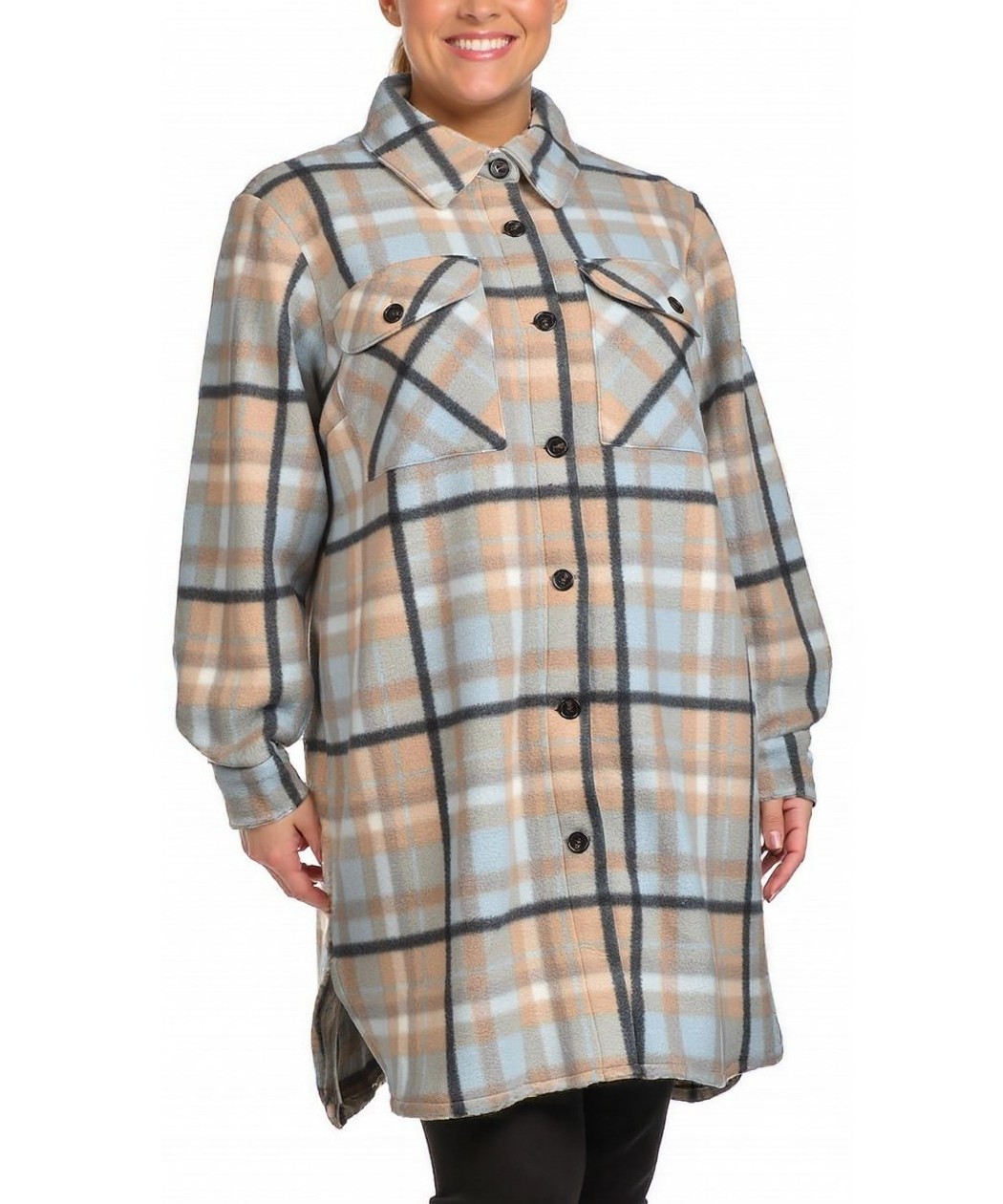 Дамско поларено яке-рубашка в мека клетка. Дълго и топло, с копчета отпред, джобчета на гърдите и маншети. Удобно, стайлинг за всеки ден и преходен сезон. Подходящо за всеки ден, работа и уикенд. XXL.
