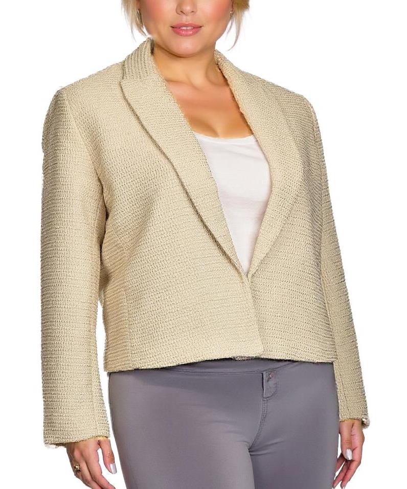 Това е елегантно дамско сако в светъл цвят, изработено от текстуриран плат. Разполага с изчистен дизайн и класическа яка, подходящо за различни официални и делови събития.