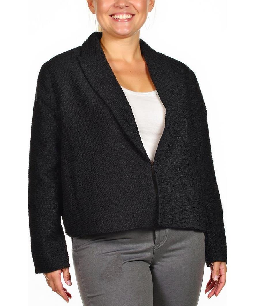 Елегантно дамско сако в черно, с меко текстурирано плетиво и прав, къс силует. Универсално за офис или ежедневно носене, с подчертан ревери и дискретна закопчалка. Комфорт и стил. Подходящо навсякъде.