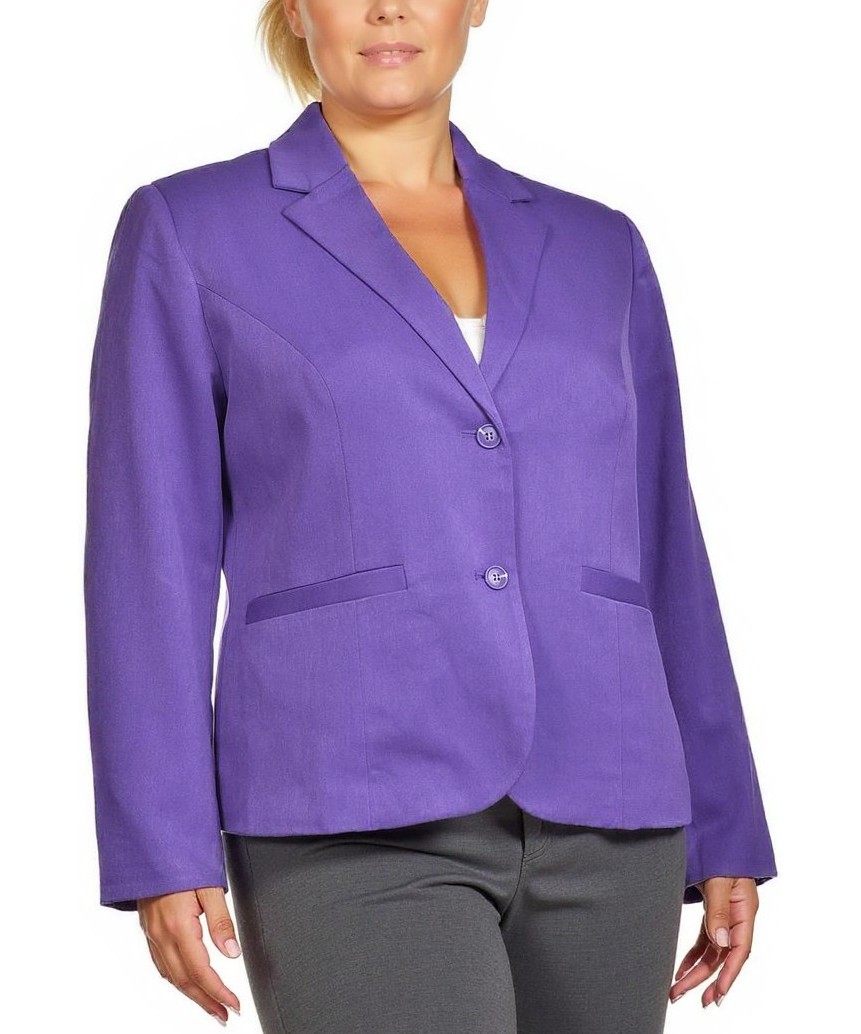 Елегантно дамско сако в наситено лилав цвят, прав силует с ревери, два бутона и джобчета. Подходящо за официални и ежедневни визии. Меко, структурирано, с леко вталяване за удобство и стил. Подход.