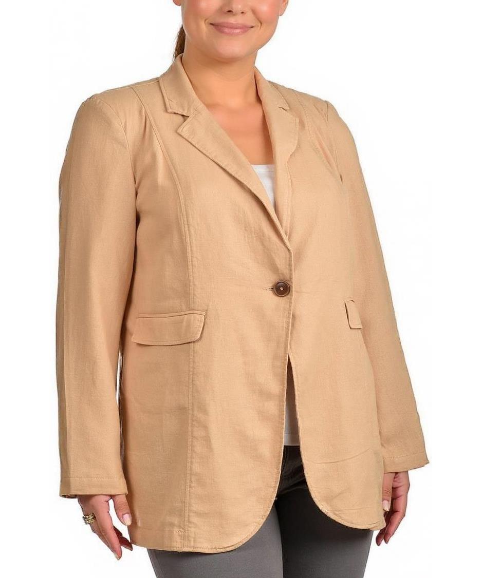 Дамско сако от ленена смес, в бежов цвят. Елегантен дизайн, допълнен с една предна копчалка и джобове с капачета. Подходящо за ежедневна и офис визия. Материята е лека и удобна.