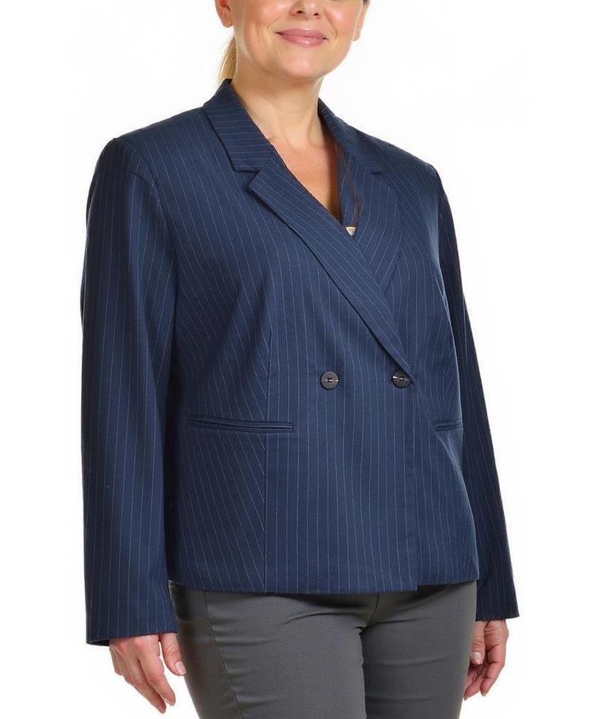 Елегантно дамско сако от вискоза в тъмносиньо с фини райета и двуредно закопчаване. Меко, дишащо и елегантно, с удобна кройка и дискретни джобове — идеално за офис и официални поводи. Универсален. XL