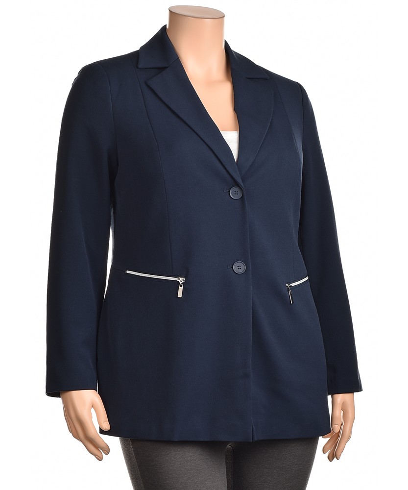 Елегантно дамско сако от вискоза в тъмносиньо, с право, леко вталено силует, двубутонно закопчаване и декоративни ципове на предните джобове. Комфортно за офис и ежедневно облекло. За модерна визия.!!