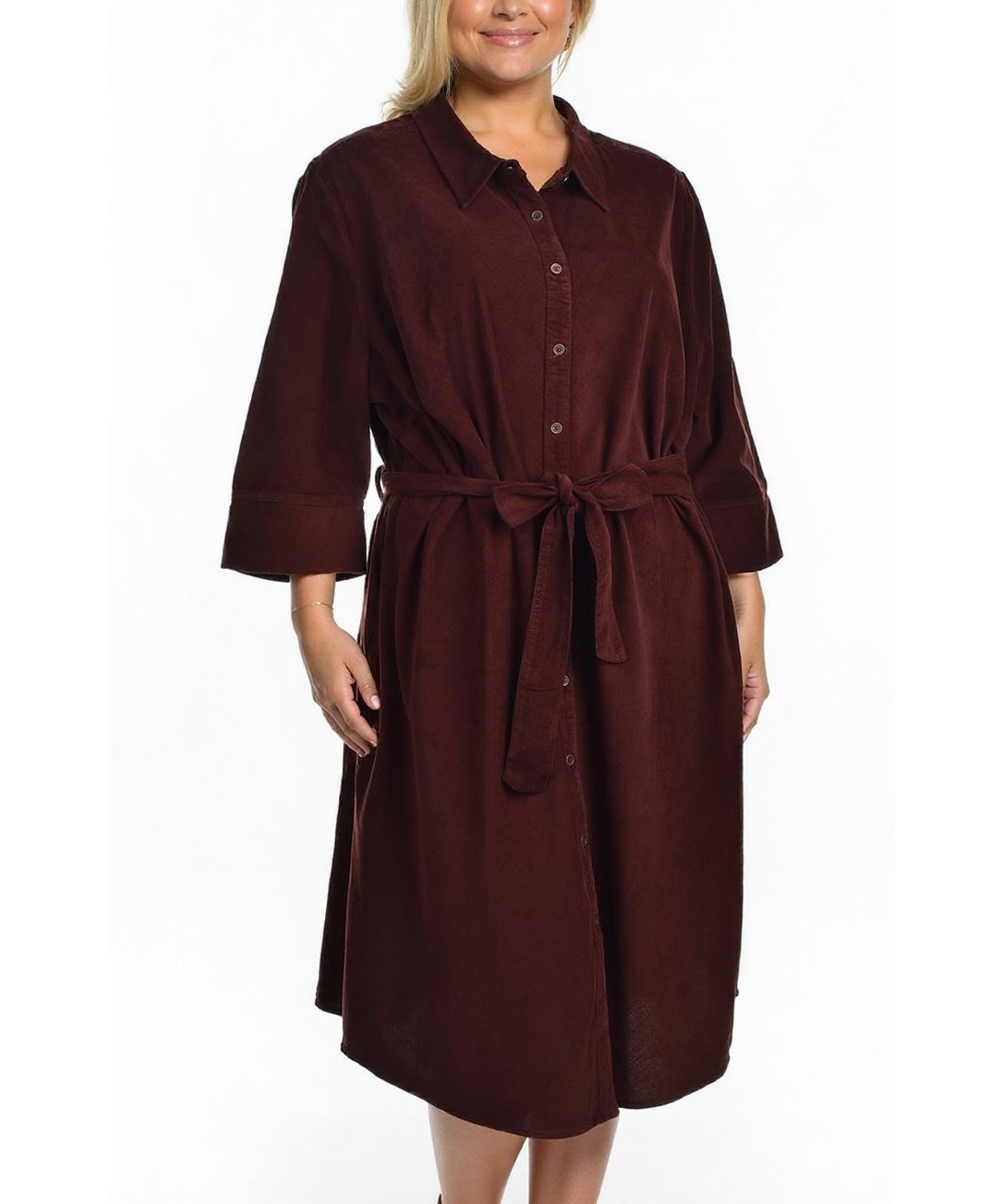 Джинсова памучна рокля с копчета, midi дължина и колан за оформяне на талията. Три-четвърти ръкави и класическа яка — удобна, стилна и универсална за ежедневие и по-елегантни поводи. В удобен силует.