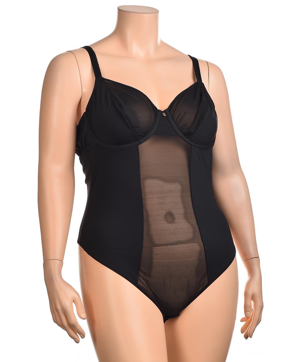 Черен корсаж-боди с оформяща линия и полупрозрачен тюлен център. Подплатени чашки и подпора за по-добър силует, регулируеми презрамки и удобна еластична материя за цял ден комфорт. Подчертава талията си