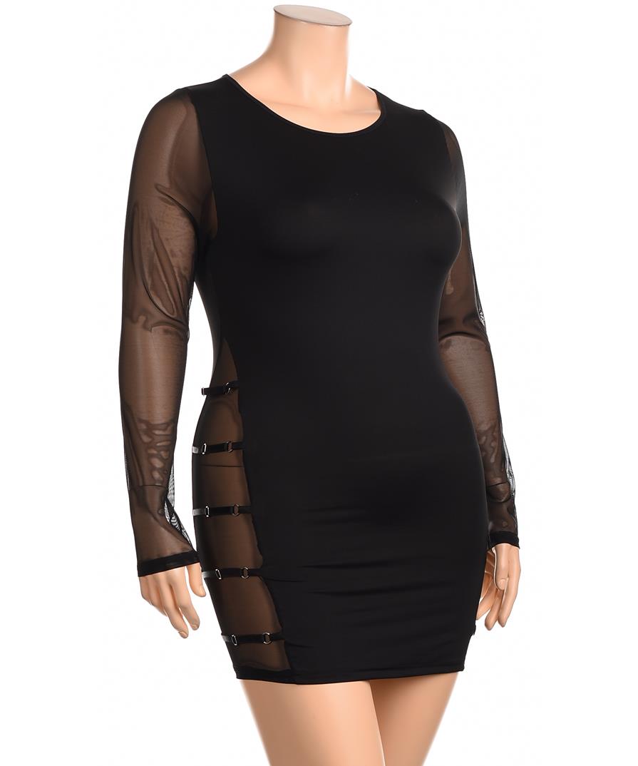 Елегантна корсаж-рокля в черно, прилепнала мини кройка с кръгло деколте. Дълги прозрачни ръкави и странични мрежести панели с декоративни катарами придават секси и смел силует. Идеална за вечерни изяви.