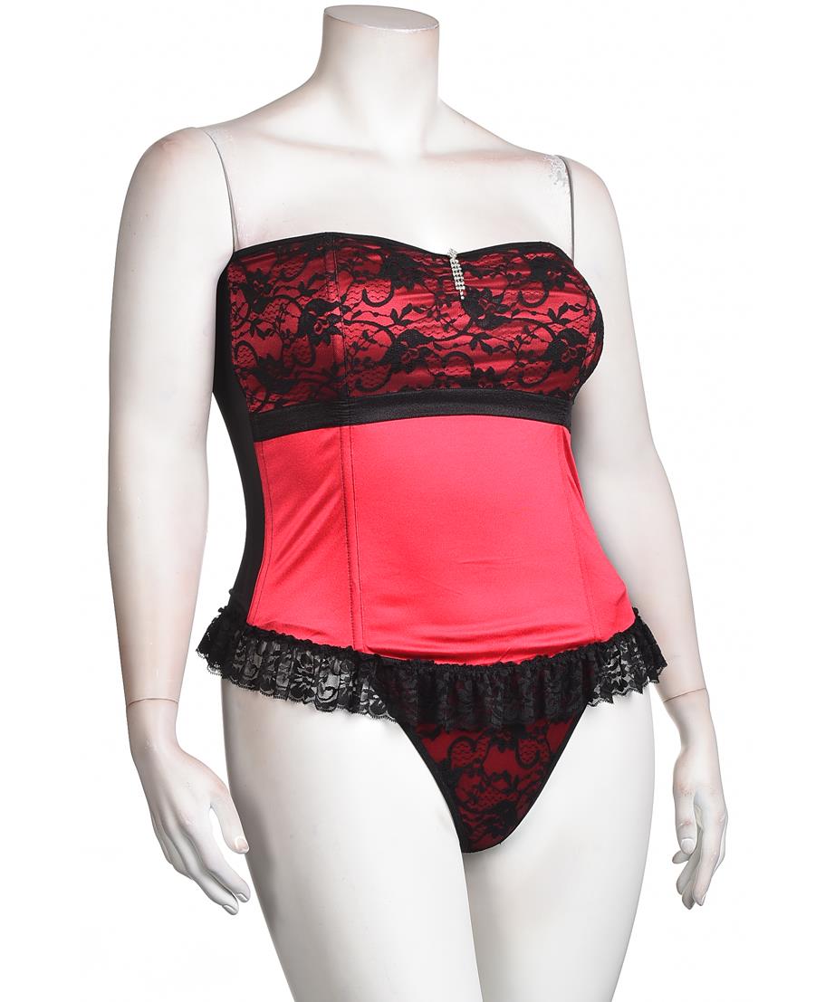Елегантен комплект корсаж и прашки в червено с черна дантела. Вталяваща кройка с подплънки, деликатни презрамки и волани. Подчертана талия и романтичен дизайн за специални вечери. Подходящ подарък!!