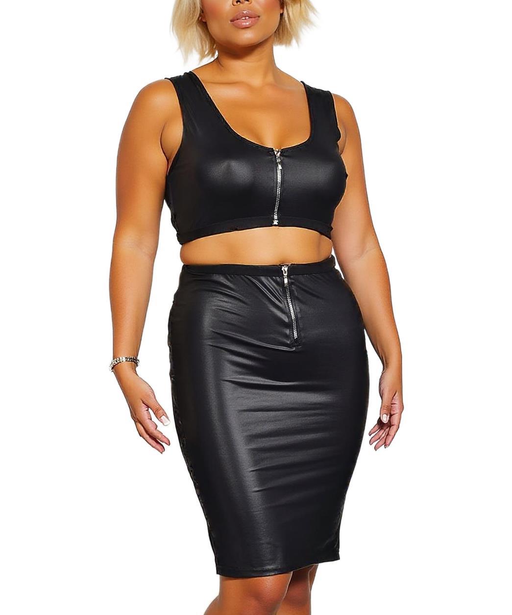 Елегантен черен кожен корсаж с преден цип. Моделът е без ръкави и с обло деколте, придаващ стилно и модерно излъчване. Подходящ за вечерни излизания или специални поводи.