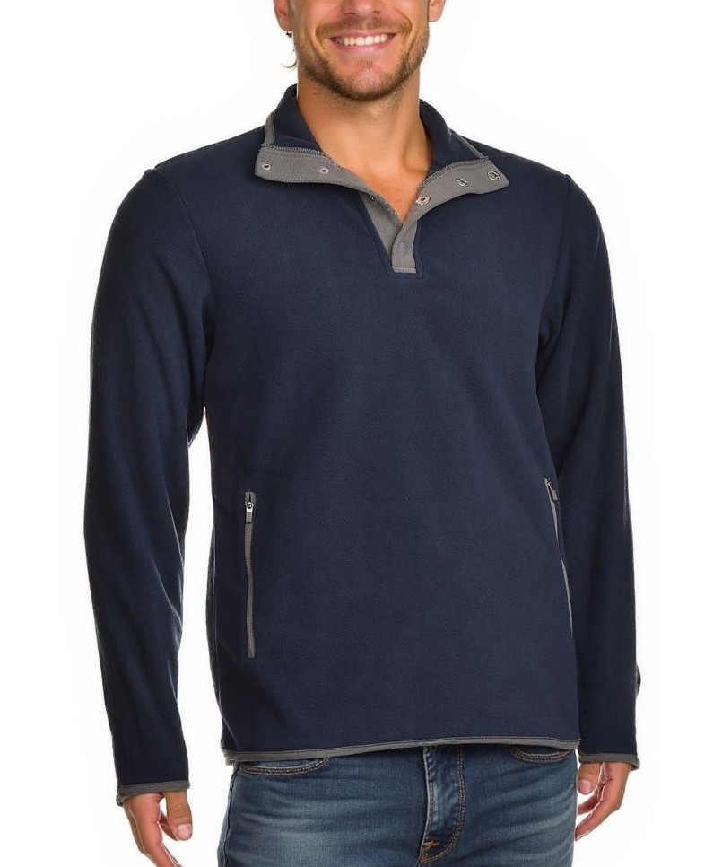 Мъжка блуза в тъмносиньо от мек и топъл плат. Поло яка с тик-так копчета, дълги ръкави и два странични джоба с цип. Идеална за всекидневен стил и комфорт през прохладните дни.
