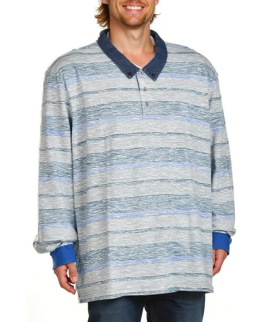 Мъжка блуза от памук с широк, отпуснат силует и дълги ръкави. Нежни хоризонтални райета в синьо и сиво, поло яка с копчета и комфортни маншети. Подходяща за ежедневие и почивка. Стилен избор. Леко. XL