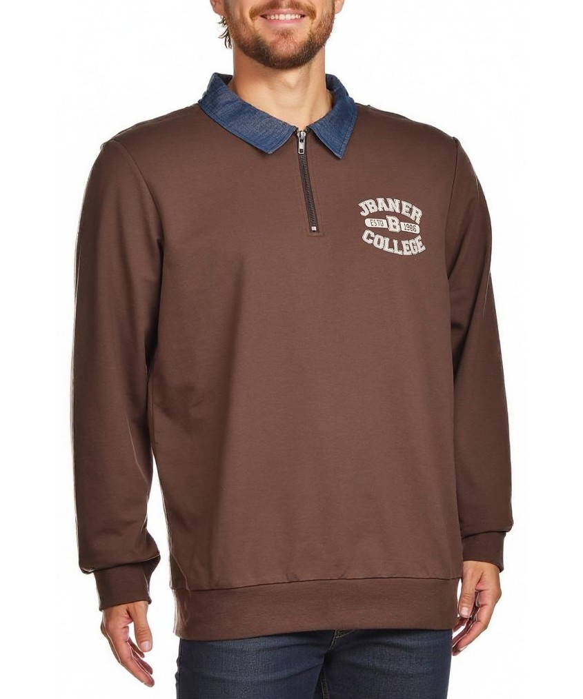 Мъжка памучна блуза в кафяво с дълги ръкави, цип на яката и джинсово-ефектен ревър. Удобна, мека материя, ластични маншети и долен край, подходяща за ежедневно и спортно-ежедневно облекло. Размери: S.