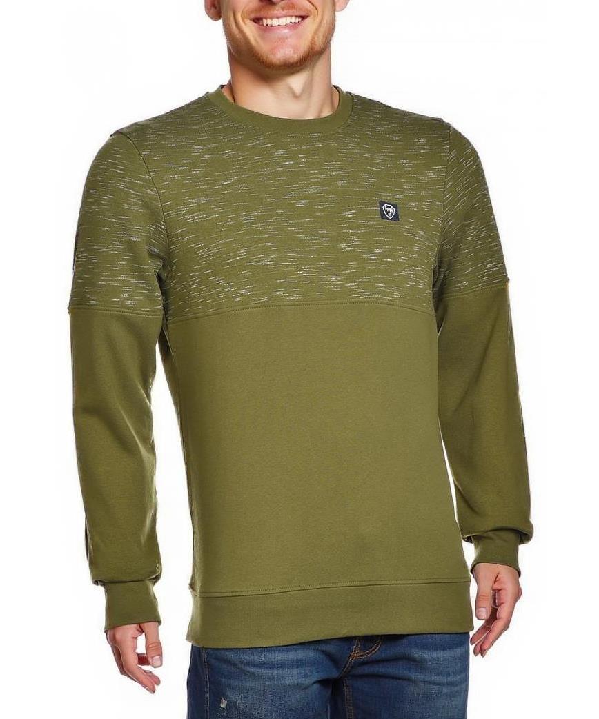 Мъжка памучна блуза в маслено зелено с дълъг ръкав и кръгло деколте. Дизайн с текстуриран горен панел, малко лого на гърдите, еластични маншети и комфортна ширина за всекидневно носене. Универсален стил.