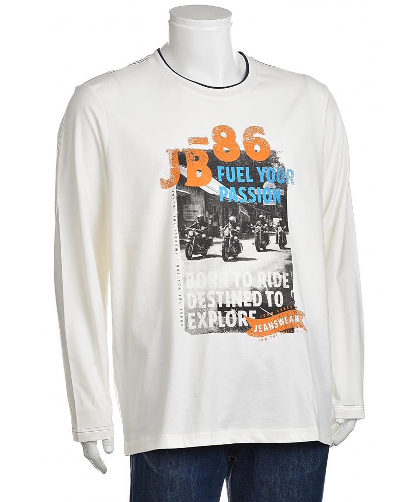 Мъжка памучна блуза с дълъг ръкав, бяла, мека и приятна на допир. Декорирана с графичен принт с мотори и надпис 'JB-86 Fuel Your Passion'. Свободна кройка, удобна за всеки ден. За всеки стил и комфорт