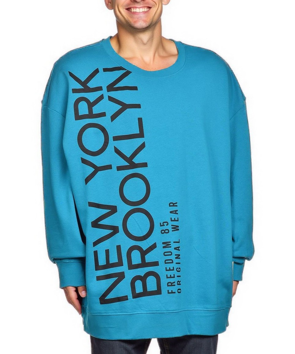Мъжка памучна блуза в тюркоазено с голям вертикален надпис NEW YORK BROOKLYN. Мека, удобна и стилна за всеки ден. Свободна кройка, дълги ръкави и практичен, оригинален дизайн. Подходяща за подарък. ВИП