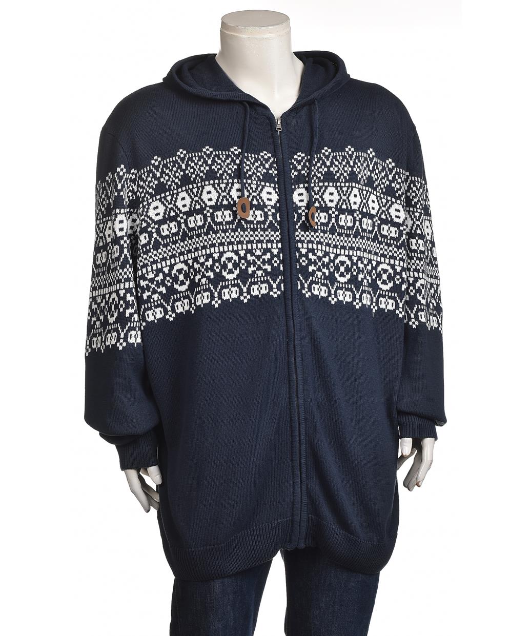 Мъжка памучна жилетка с качулка и цип в тъмно синьо, декорирана с бяла фолклорна шарка. Свободна кройка, рипсен подгъв и маншети, удобни джобове и дървени декоративни капси на връзките. Стилна и топла.