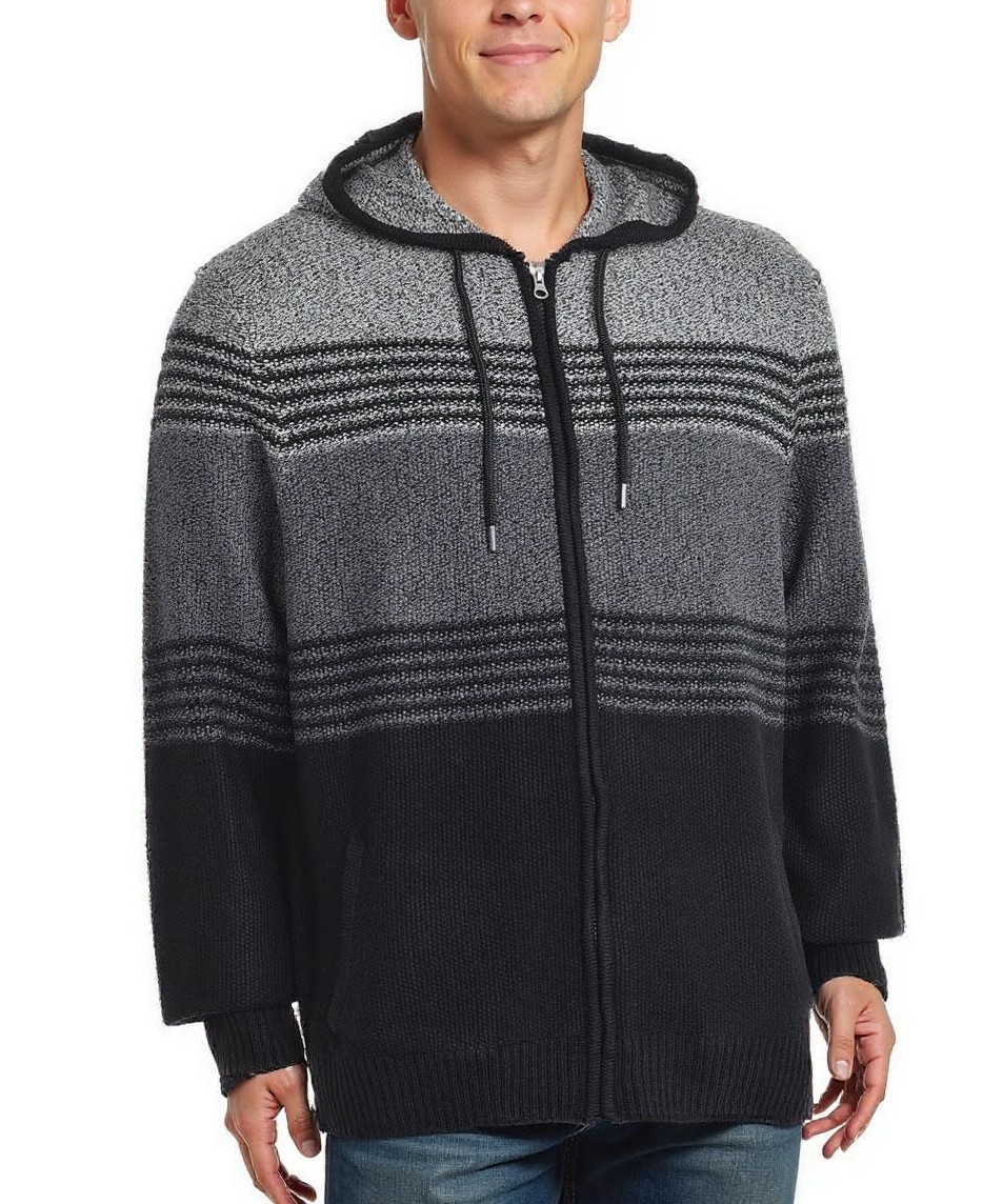 Мъжка плетена жилетка с качулка и цип, вълненоподобна текстура в сиви и тъмносини нюанси. Удобни джобове, еластични ръкави и подгъв. Стилна, топла и практична за ежедневието. Идеална за пролет и есен.