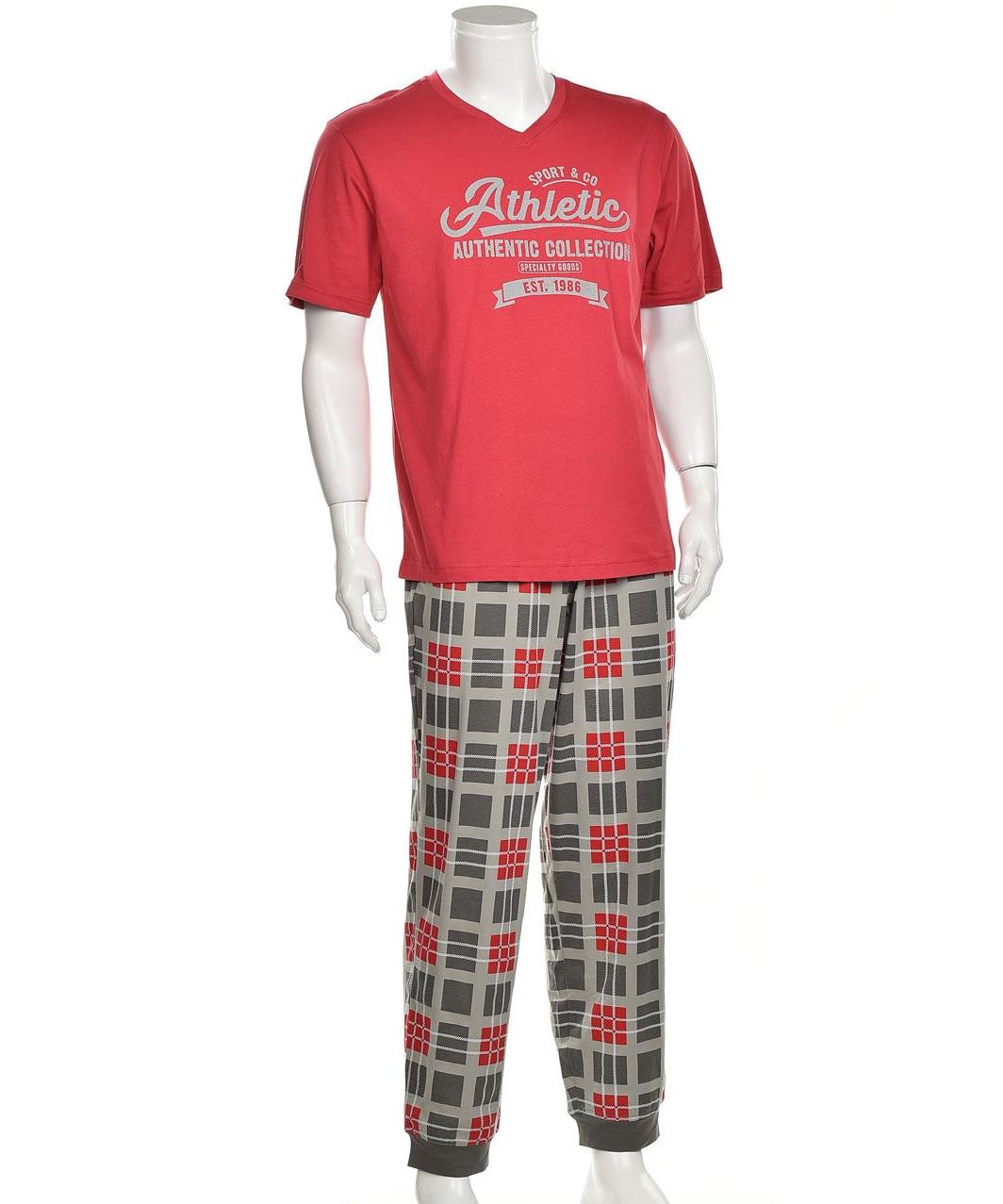 Мъжка памучна пижама: червена тениска с V-образно деколте и надпис, карирани сиво-червени панталони с ластик в талията. Мека, дишаща и удобна за спане и почивка вкъщи. Класически спортен стил. Размери