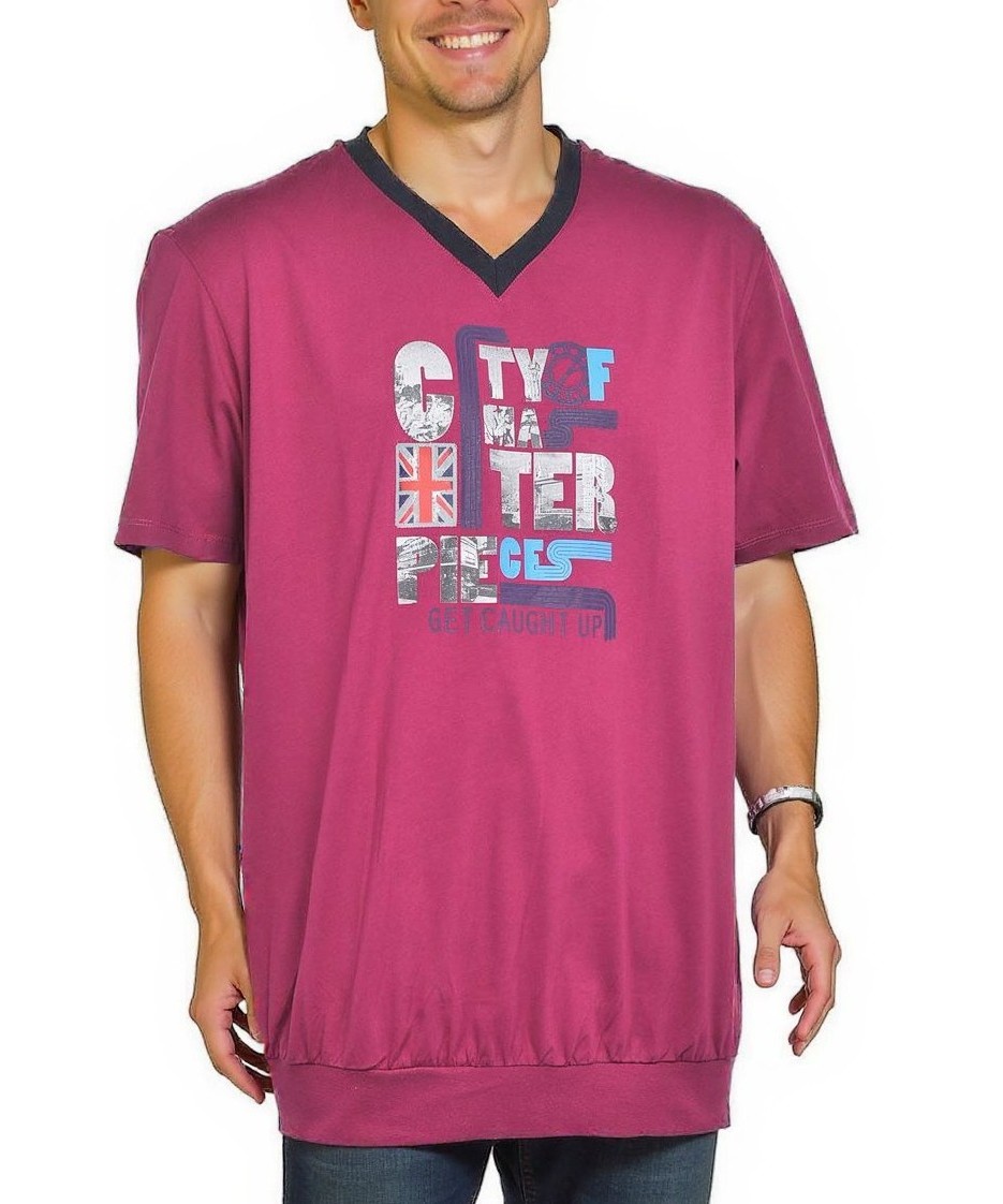 Мъжка памучна тениска с V-образно деколте и модерен принт отпред. Мека, дишаща и удобна за ежедневно носене. Свободна кройка, еластичен подгъв и качествена изработка. Подходяща за спорт и свободно време.