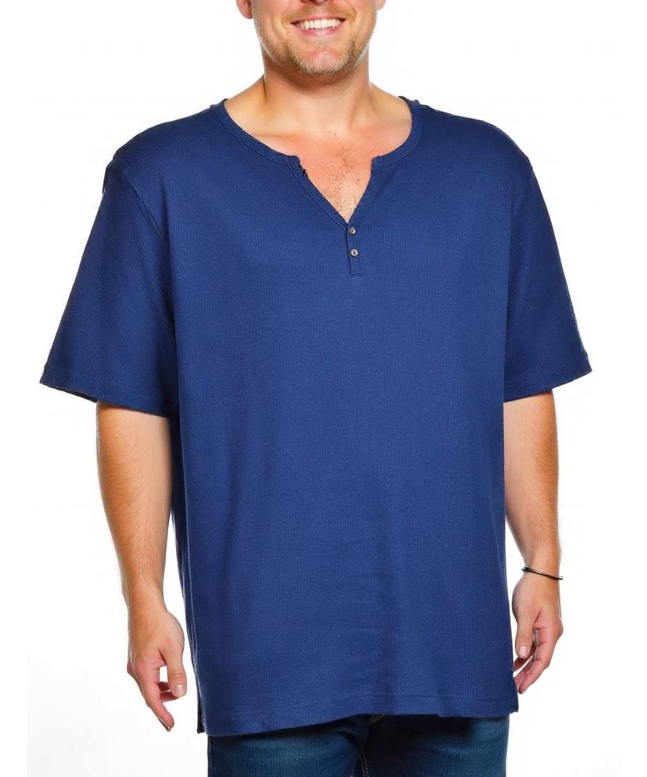 Мъжка тениска в тъмносин цвят, изработена от мек памучен материал. Дизайнът включва къси ръкави и три копчета отпред за допълнителен стил. Подходяща за ежедневна употреба и удобство.