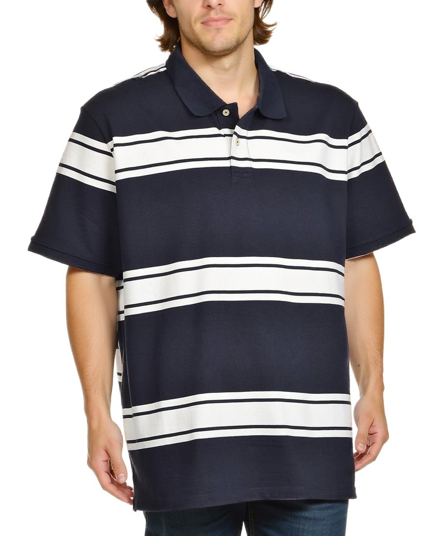 Мъжка памучна тениска тип поло в тъмносиньо с контрастни бели райета. Класическа яка, къс ръкав и свободна кройка за комфорт. Идеална за ежедневно и елегантно-спокойен стил. Мека и дишаща, лесна за пране