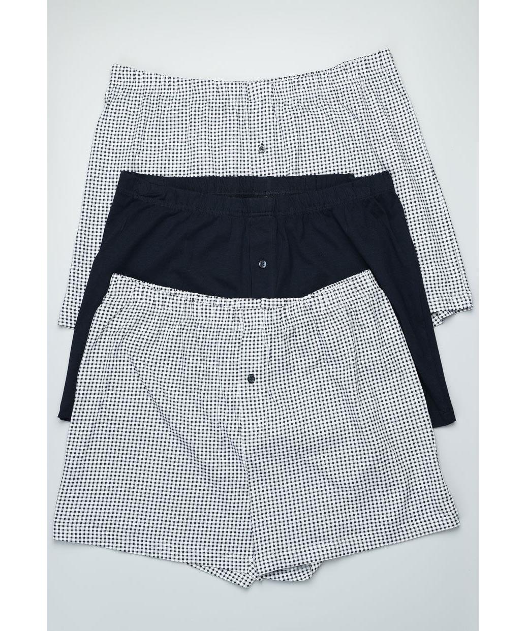 Мъжки боксерки 3 бр. от памук, меки и дишащи, с еластична талия и удобна кройка. Два каре десена и един тъмносин, подходящи за всеки ден. Машинно пране, бързо съхнене и дълготрайност при ползване. БГ.