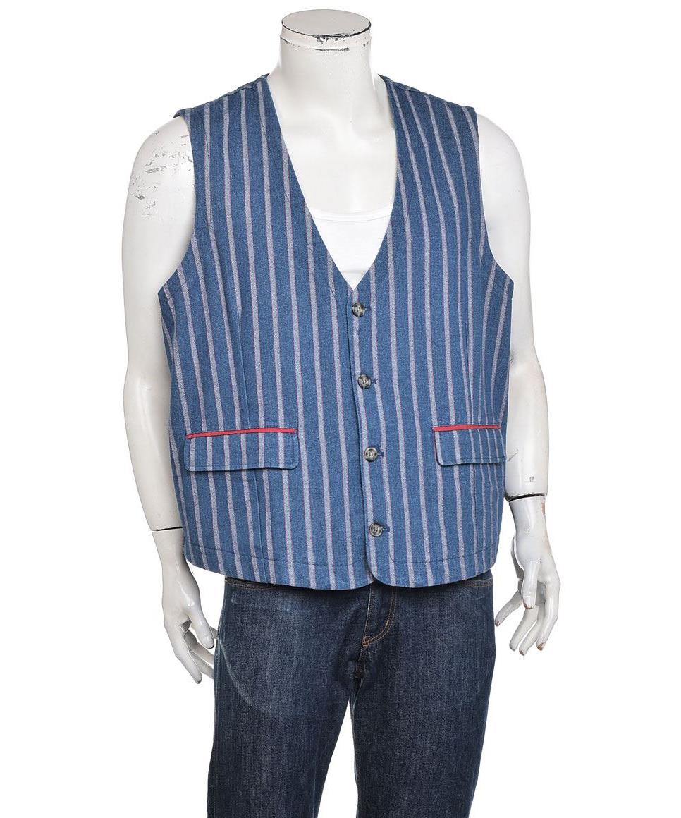Класически мъжки елек от 100% памук в синьо с бели вертикални райета. Лек, дишащ и удобен, с V-образно деколте, 4 копчета и джобчета с червена декорация. Подходящ за ежедневен и елегантен стил. винаги