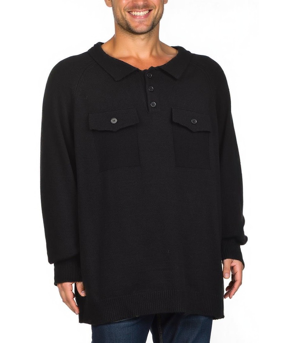 Мъжки памучен пуловер в черно, с поло яка и три копчета, две горни джобчета с капаци, рипсен кант на ръкавите и долния край. Комфортна свободна кройка, стилен ежедневен модел. Подходящ за всеки ден.