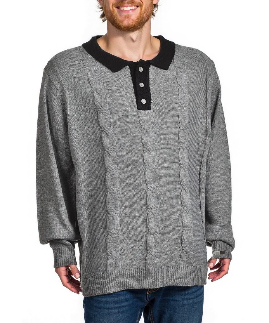 Мъжки пуловер сиво и черно, мека плетка със спираловиден релеф отпред. Яка с копчета, дълги ръкави, ластични маншети и подгъв. Удобен, ежедневен модел за студено време. Стилен избор за есен и зима. XXL