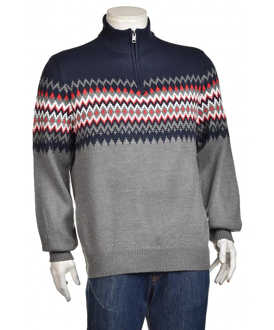 Мъжки пуловер с висока яка и цип, сив с геометричен орнамент в тъмносиньо, бяло и червено в горната част. Топъл, удобен, с плътна плетка и еластични маншети — класика за студените дни. Стилен избор.!!