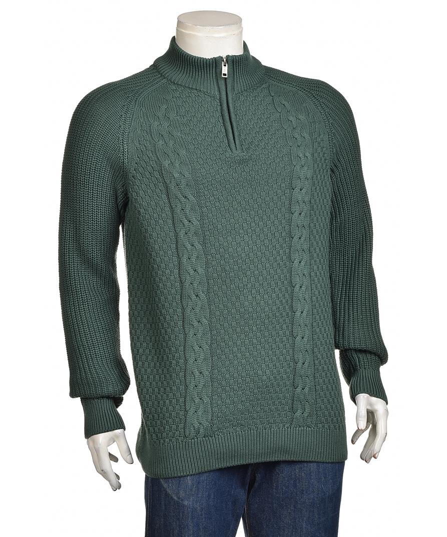 Мъжки памучен пуловер в тъмнозелено, с релефна плетка и цип до врата. Мек, дишащ и удобен за ежедневно носене. Класически силует, здрави ръкави. Подходящ за офис и свободно време. Лесна поддръжка. И моден.