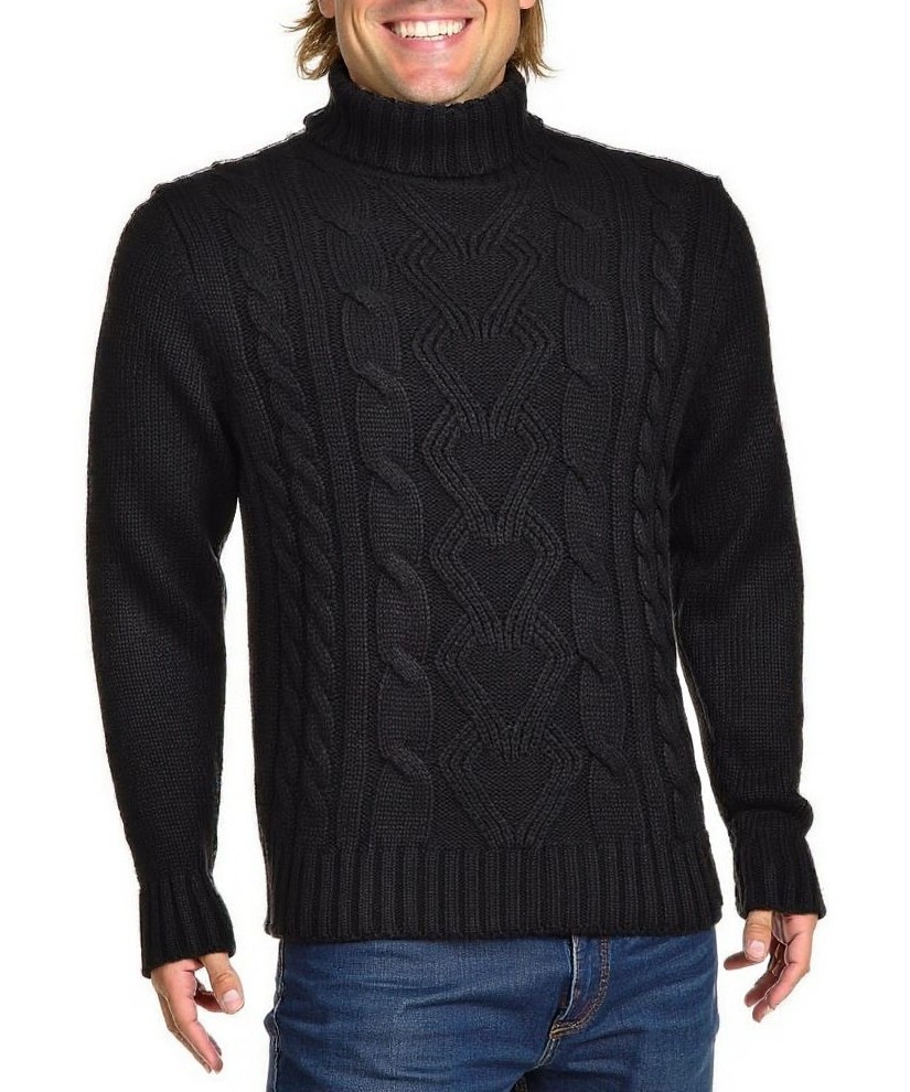 Топъл мъжки пуловер в тъмносин/черен цвят с плетеница отпред и висока поло яка. Плътна, мека материя, рипс в маншетите и талията, класическа кройка за ежедневно и по-елегантно обличане. Идеален избор